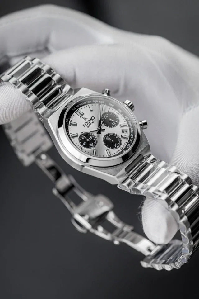 Elegancia de alto contraste para el hombre moderno. Este Kosmo combina la sofisticación clásica con un toque deportivo gracias a su acabado sunray. Su esfera en blanco y negro captura y refleja la luz de forma magistral, convirtiéndose en el complemento ideal tanto para un traje de negocios como para un estilo casual refinado.